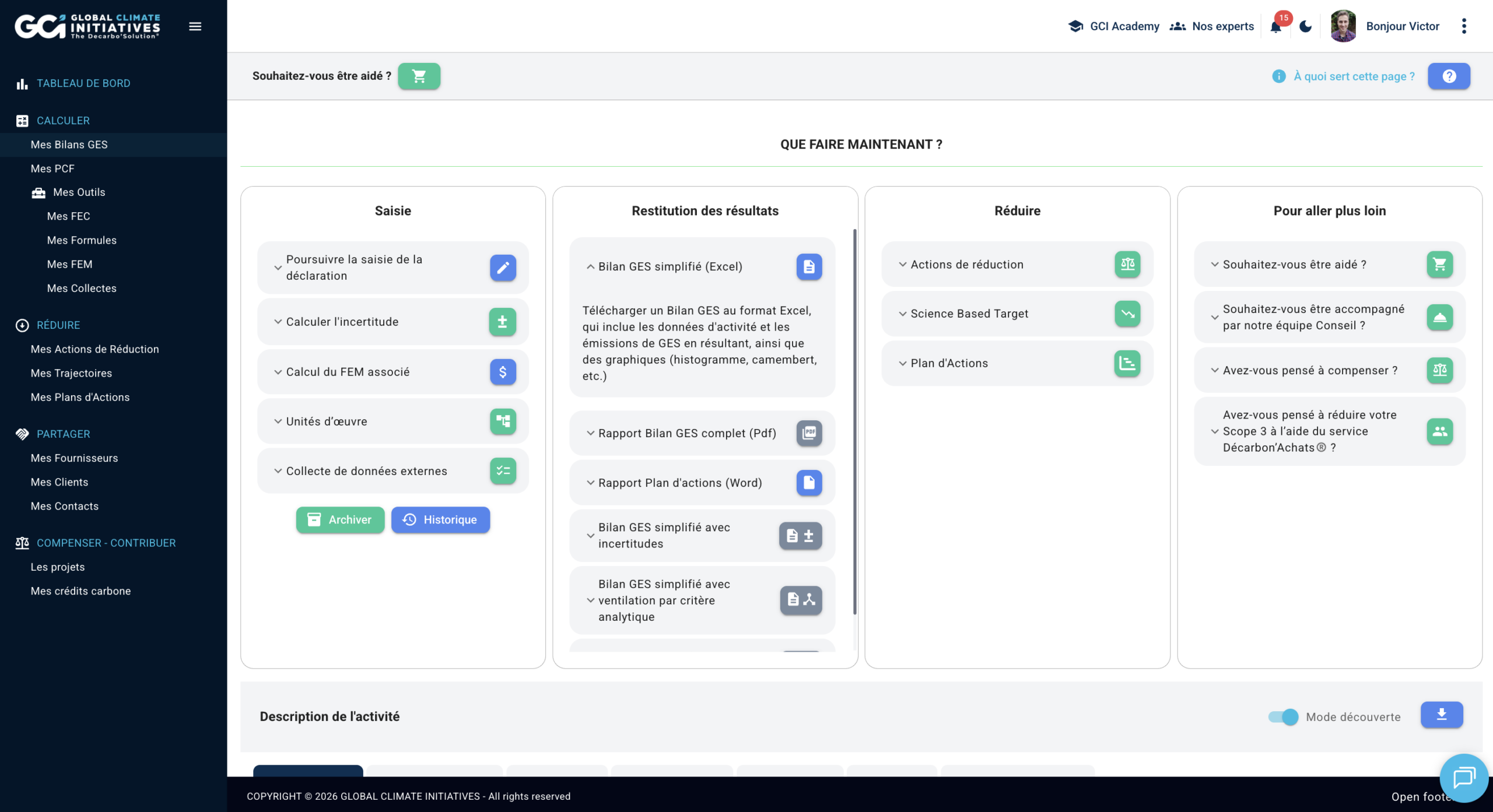 Pour réaliser votre bilan de gaz à effet de serre (GES), définir et gérer votre plan d’action de réduction, cliquez sur “Calculateur carbone”.
